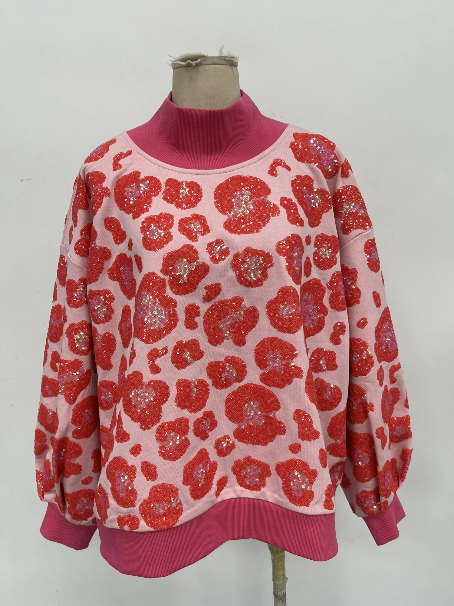 Pink sassy leopard sequin mockneck