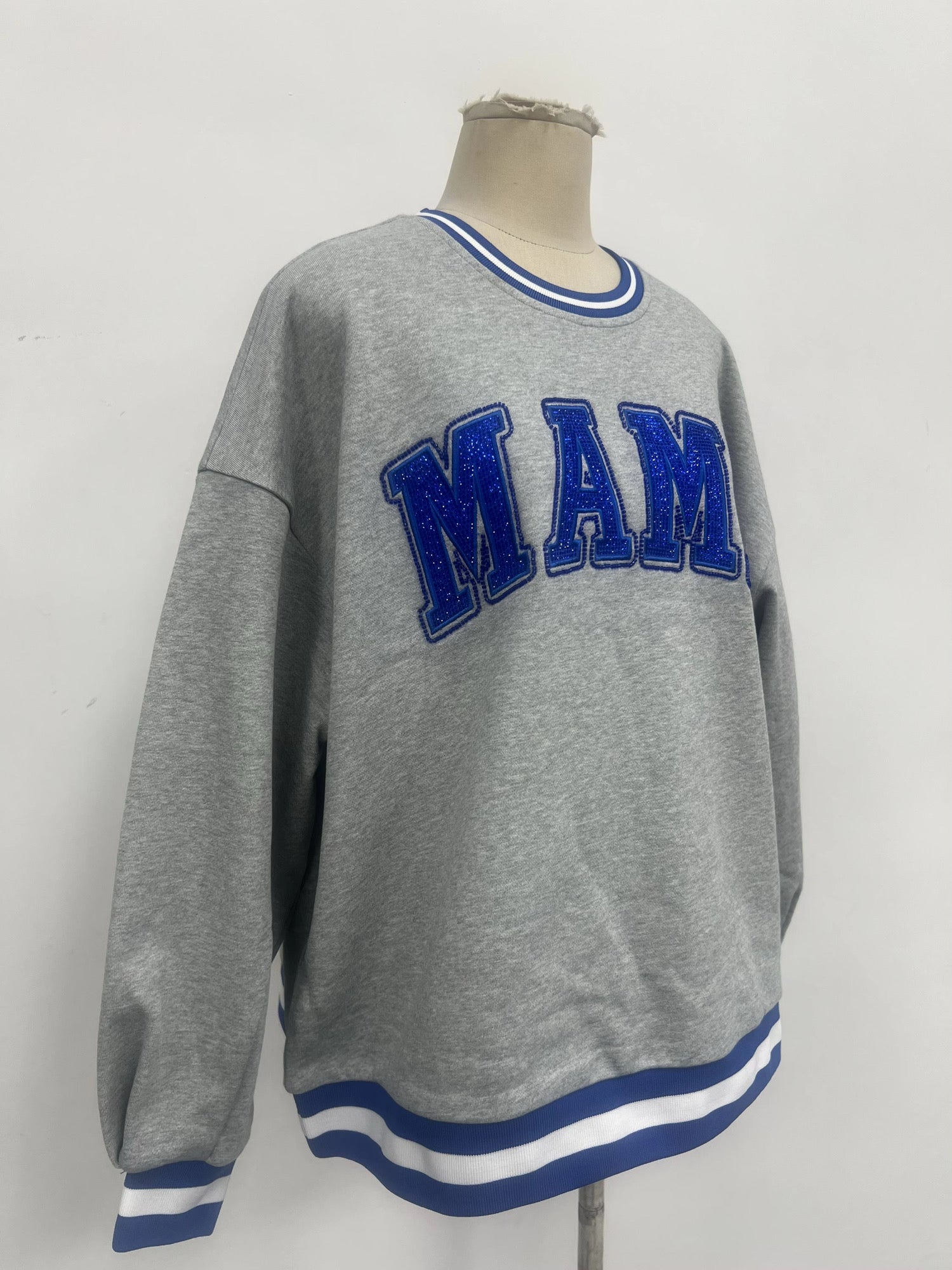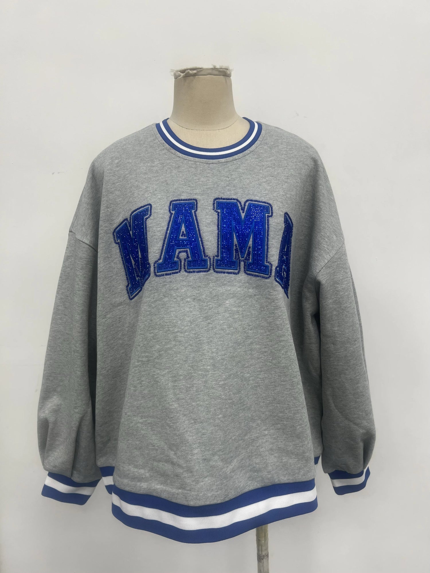 Mama blue rhinestone beaded varsity pullover