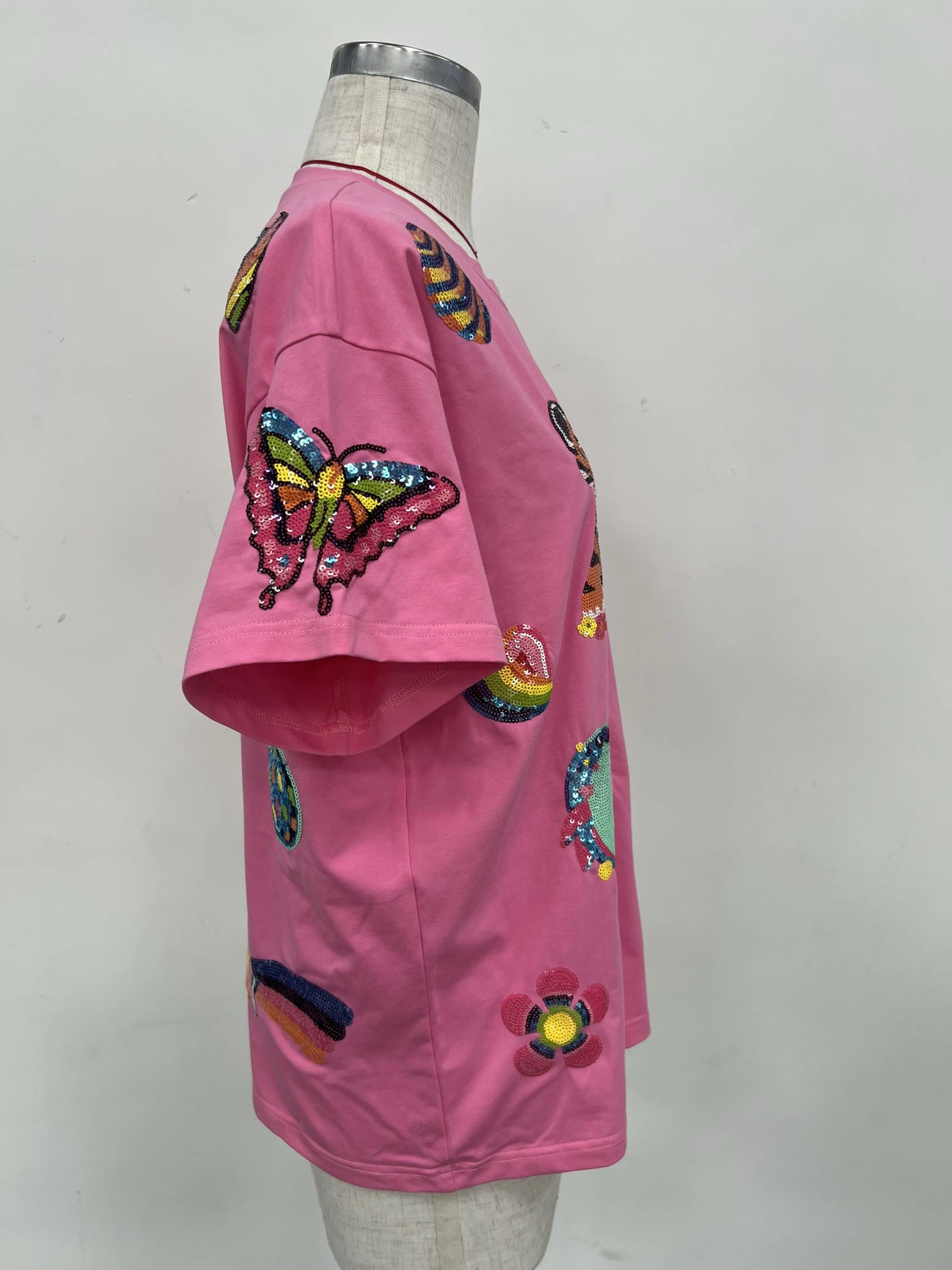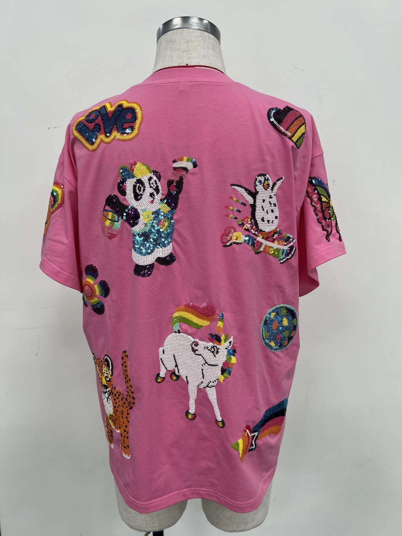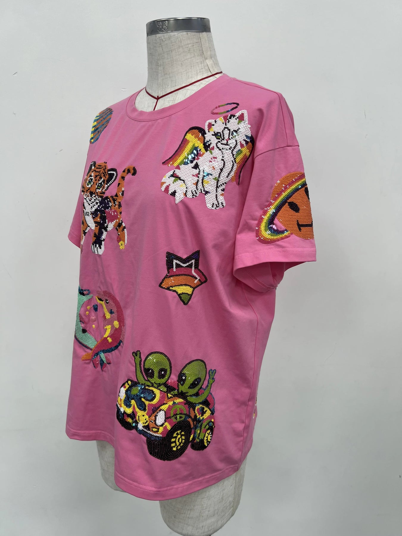 This vibrant pink tee is covered in playful, nostalgic icons that feel straight out of your favorite childhood daydreams. MAY ARRIVAL