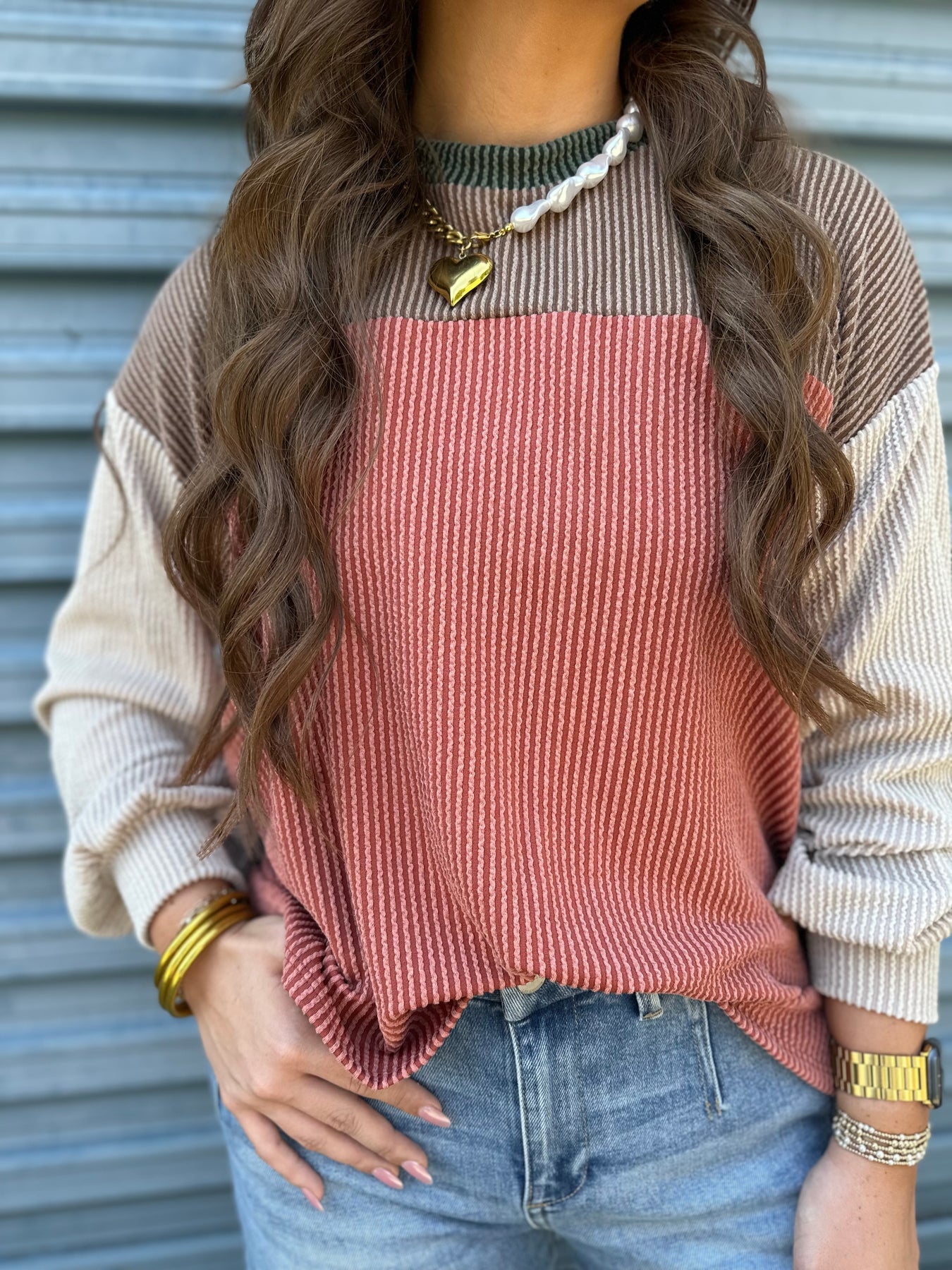 Wrap yourself in cozy charm with the Autumn Spice Sweater. Featuring a chic mix-and-match color block design in warm cinnamon tones, this soft rayon blend keeps things comfy yet stylish. With cuffed sleeves and a