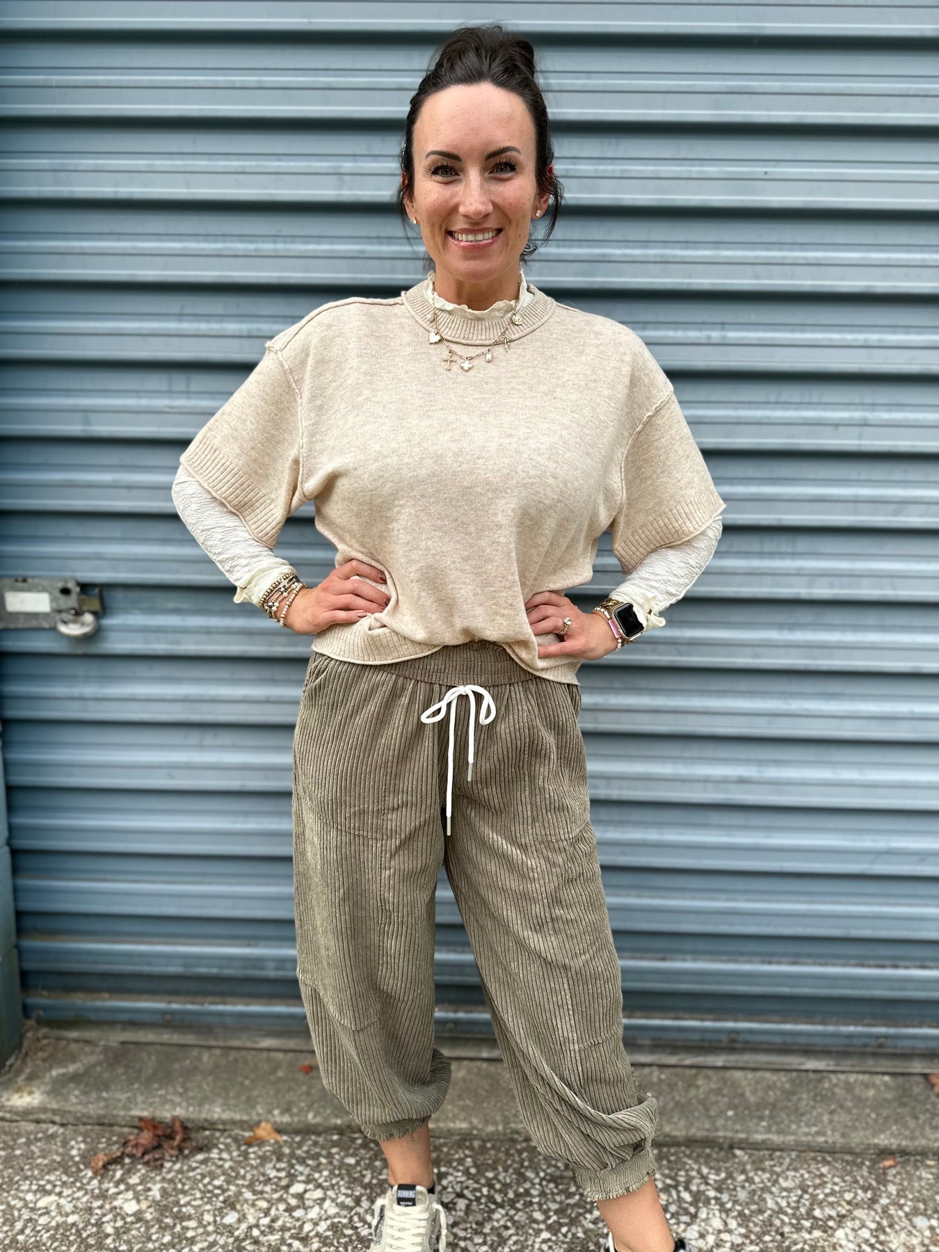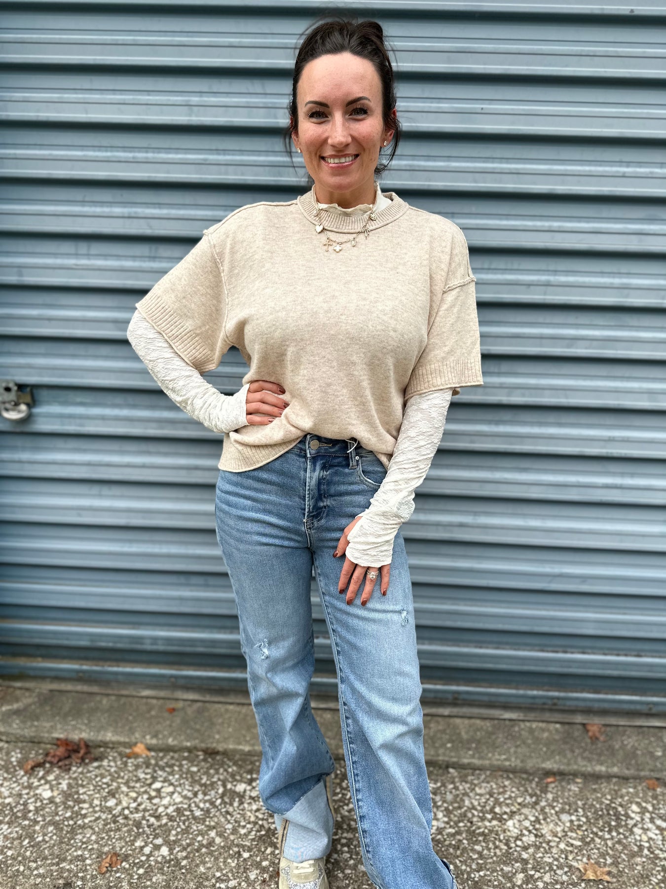 Embrace cozy elegance with the Autumn Whisper Knit Top. This beige, short-sleeved sweater offers a delicate balance of comfort and style, making it a versatile addition to your wardrobe. The soft knit fabric provides a gentle touch against the skin, perfect for transitioning between seasons. Its simple yet refined design allows for effortless pairing with a variety of outfits, from casual jeans to more polished skirts. Whether you're enjoying a crisp morning walk or settling in for a relaxed evening, the Autumn Whisper Knit Top will envelop you in warmth and sophistication.