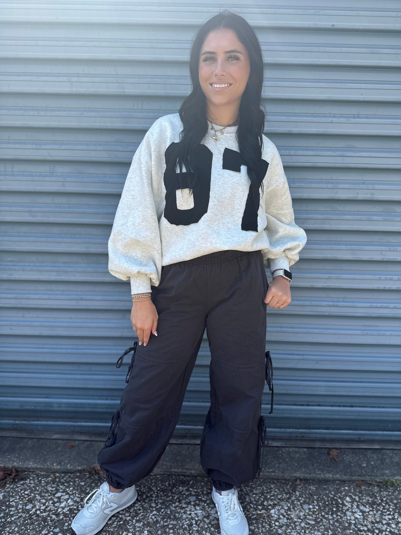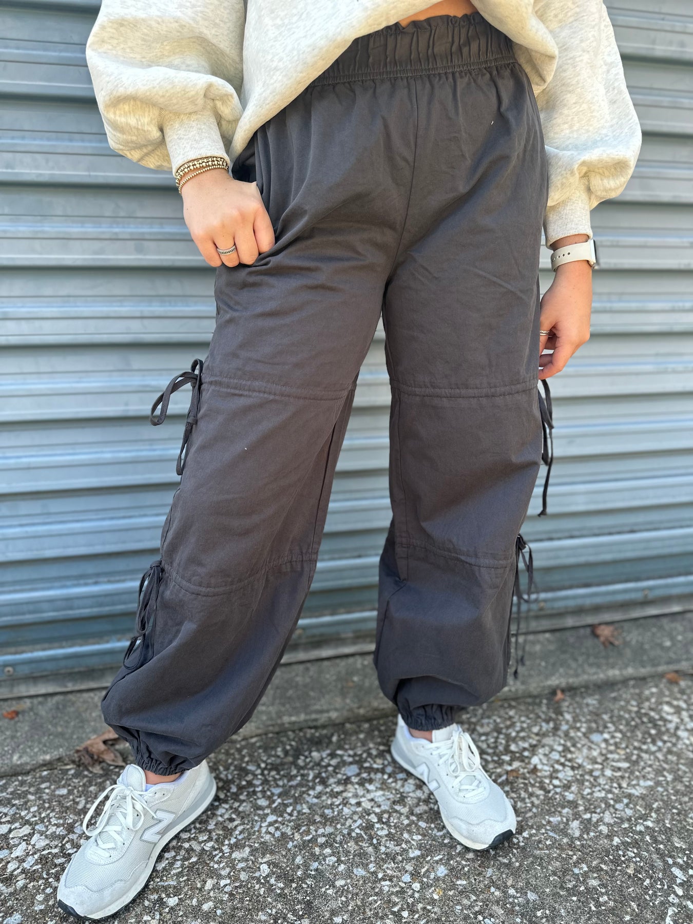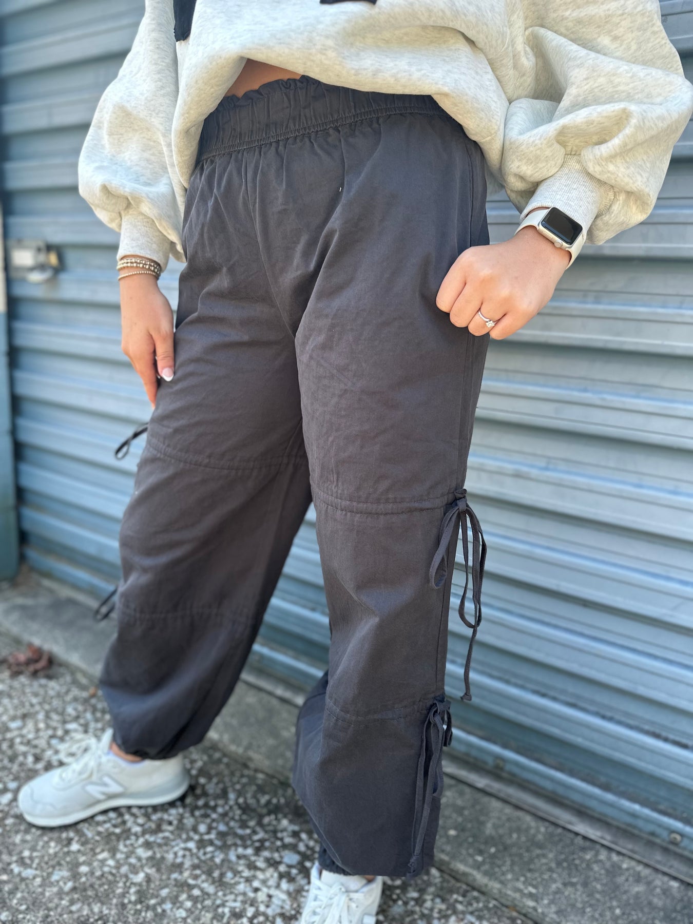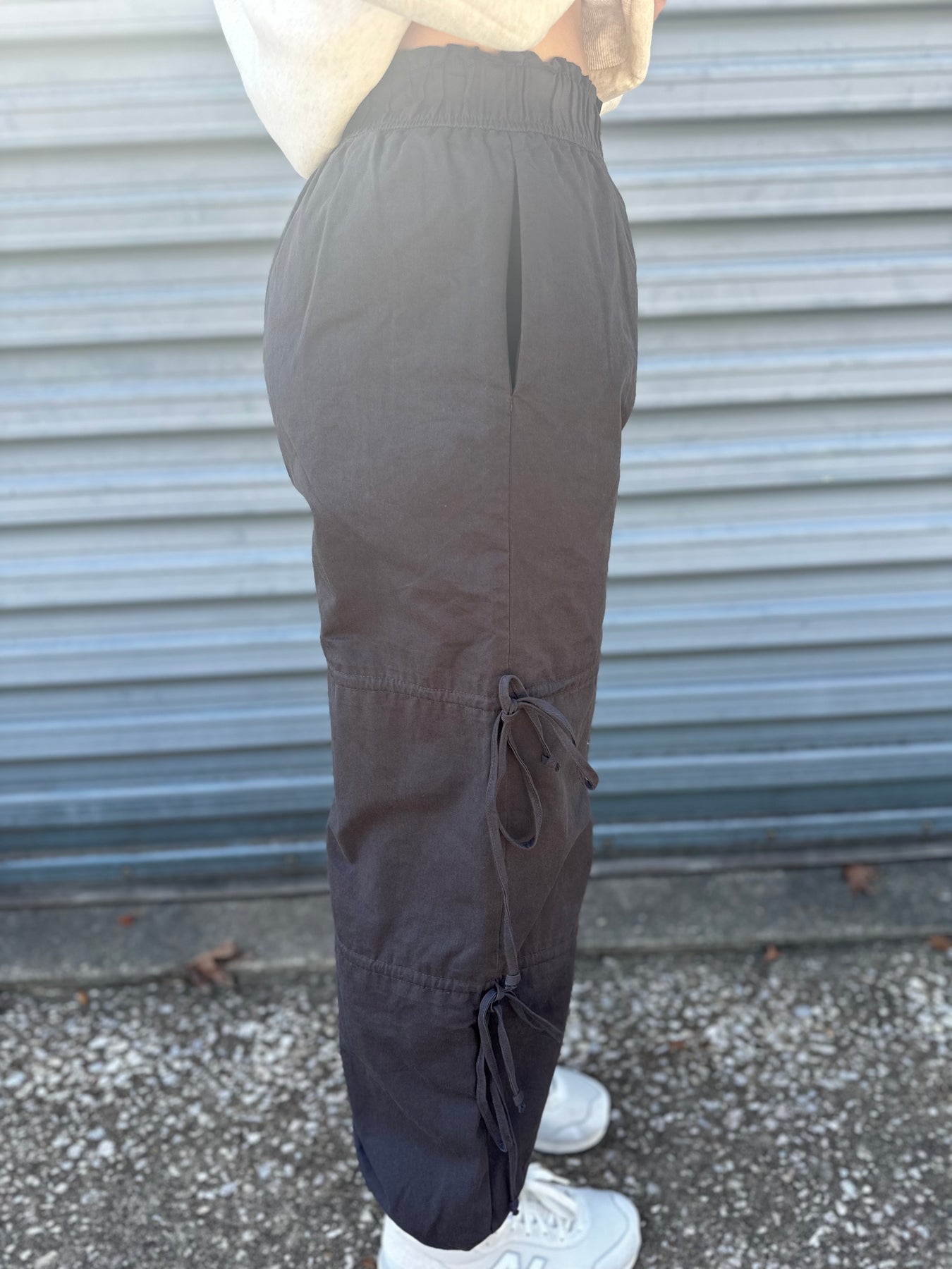 Edgy black cargo pants with bow accents. These combine the utility of cargo pants with a playful, fashionable detail, perfect for making a statement.