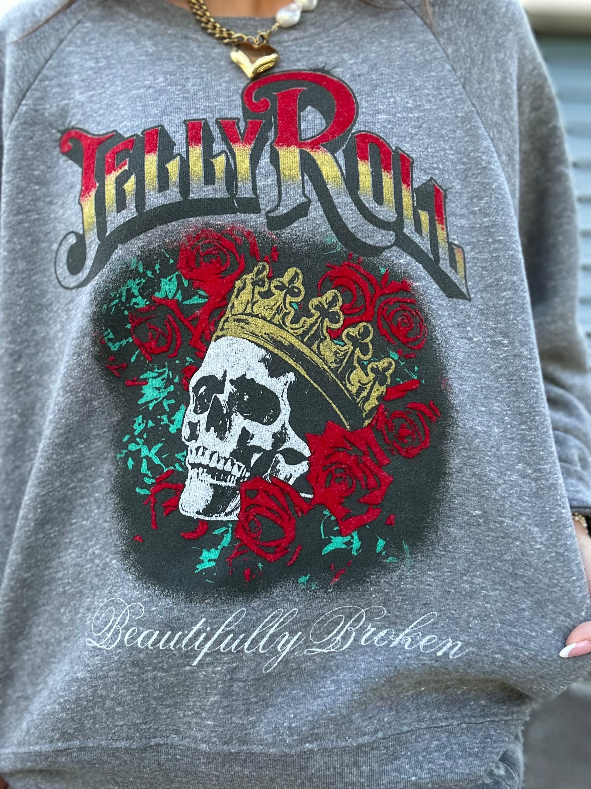 The Daydreamer Pullover features a bold "Jelly Roll" graphic with a crowned skull surrounded by roses and the inspiring phrase "Beautifully Broken" beneath. Made from soft gray fabric, it offers a perfect blend of edgy style and comfortable wear, complemented by subtle details like a gold heart-shaped pendant necklace for a touch of personal flair.