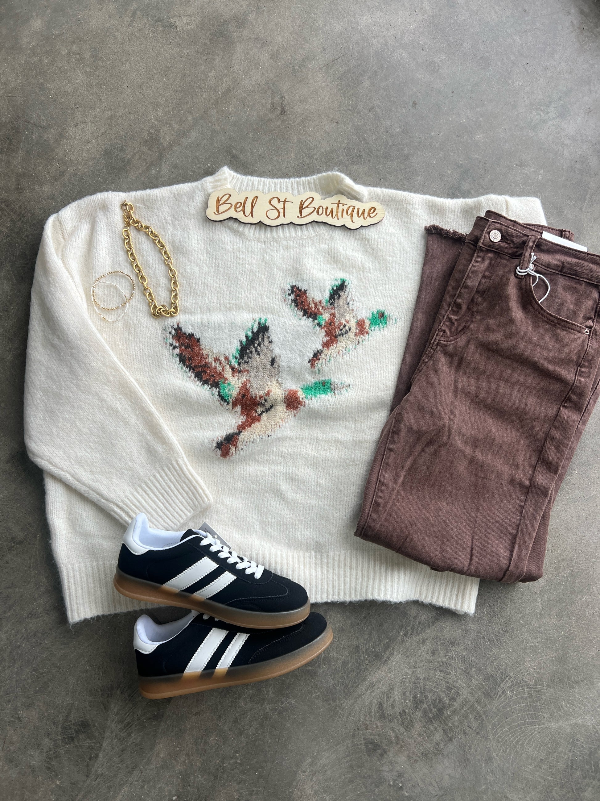 This cream knit sweater is the perfect mix of cozy and unique. Featuring a relaxed fit and a playful duck design stitched across the front, it adds a touch of charm to your everyday look. Soft, warm, and easy to style, this piece pairs effortlessly with jeans, skirts, or your favorite casual bottoms for a cute yet comfortable outfit.