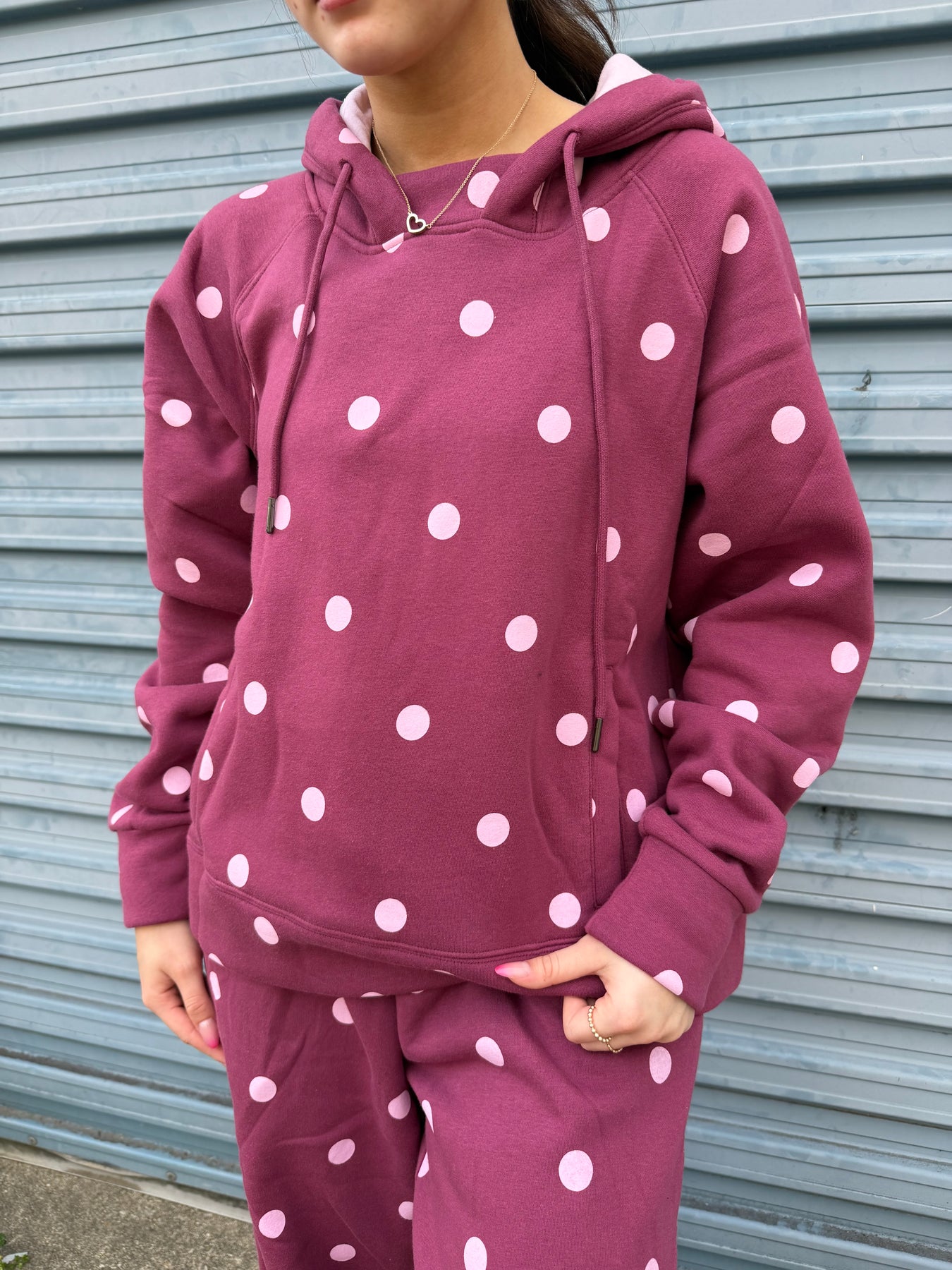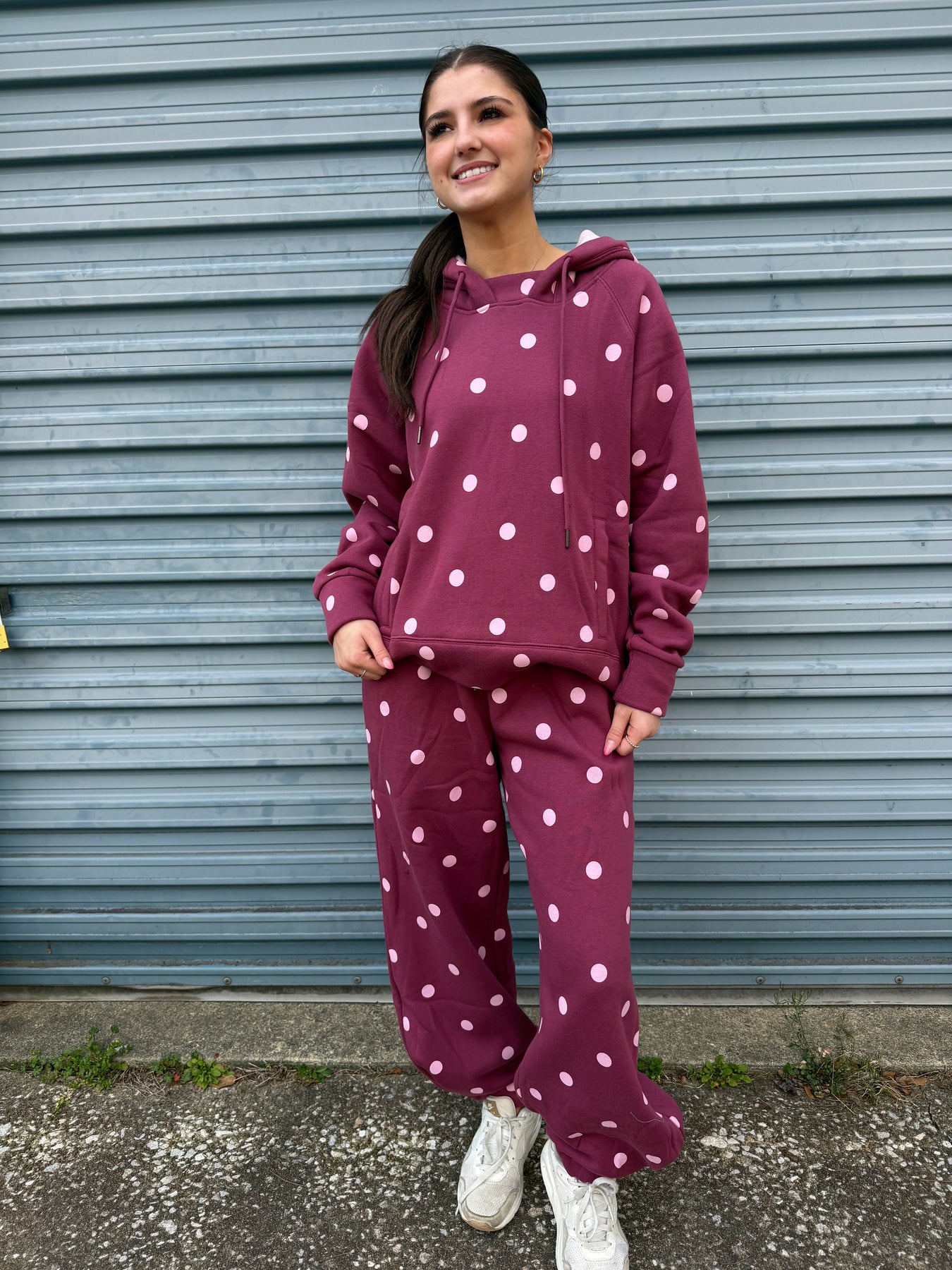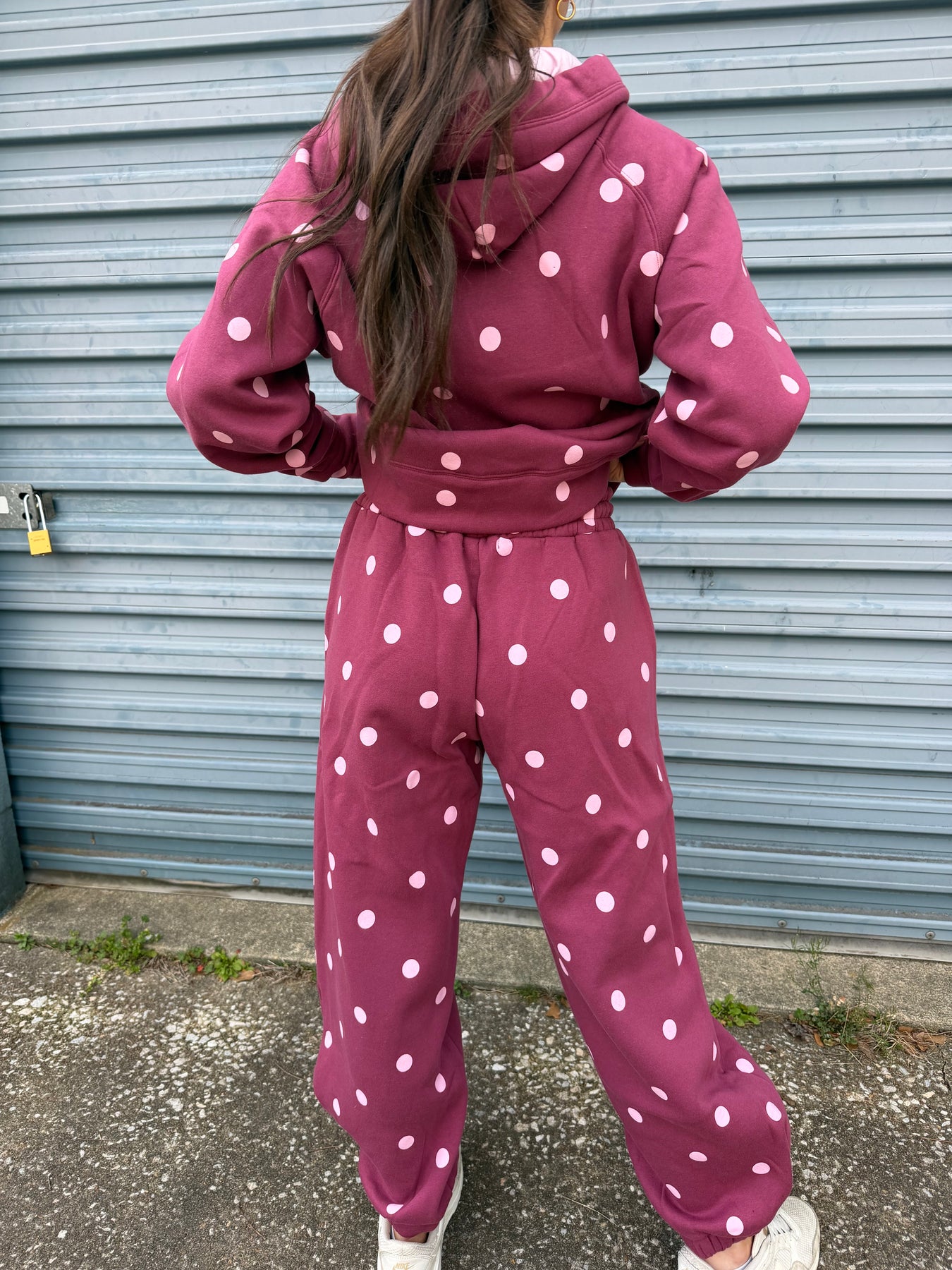 Complete sweatsuit set featuring a comfortable hoodie and matching sweatpants in our signature Maroon Pink Polka Dot pattern. Perfect for lounging, workouts, or casual wear.