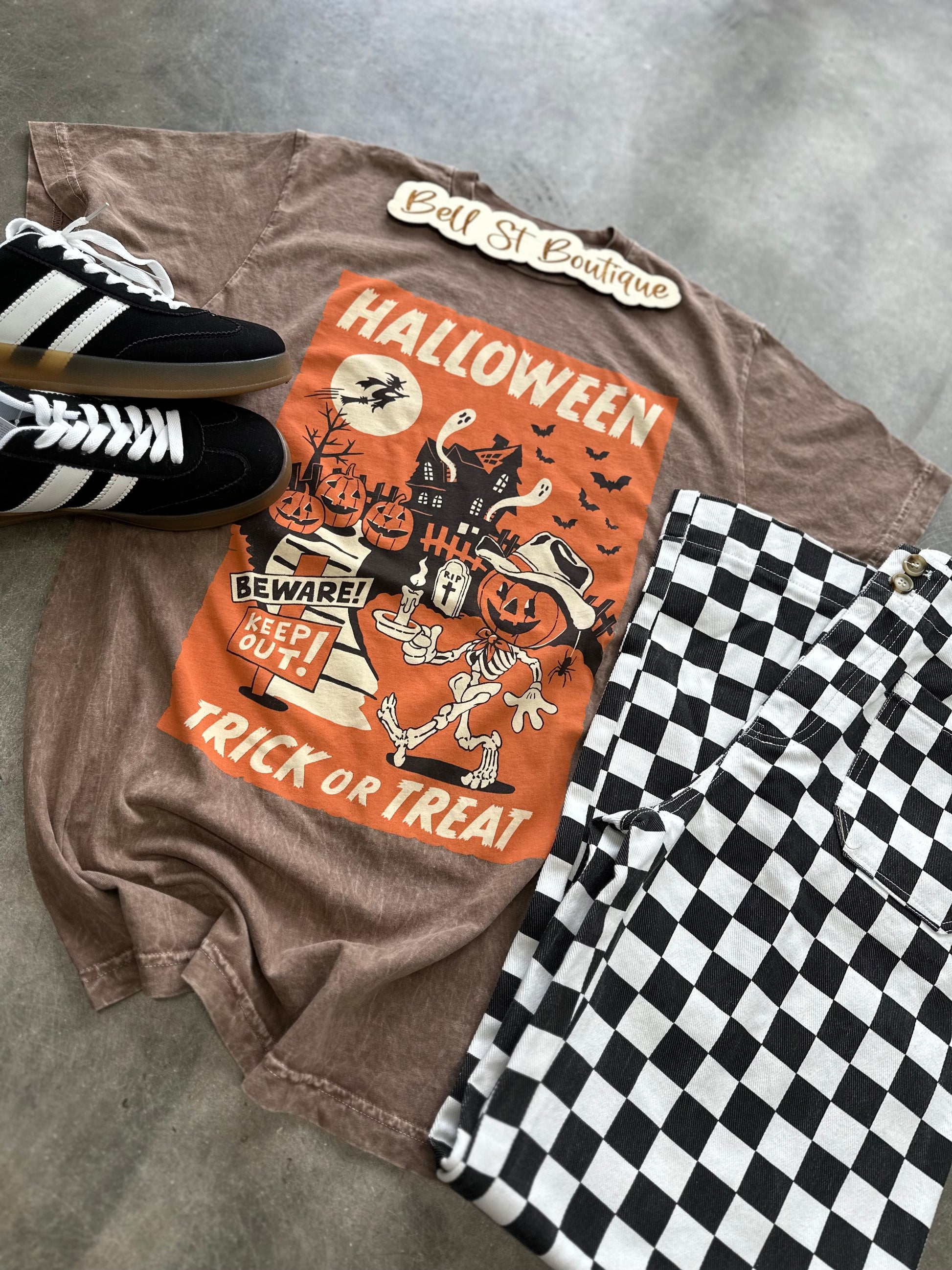 Get into the spooky spirit with this folded brown t-shirt featuring a vibrant, retro-style Halloween graphic. The design includes a haunted house, playful ghosts, bats, pumpkins, and a witch flying on her broom, all topped off with the word "HALLOWEEN" in bold letters. Perfect for adding a touch of vintage charm to your Halloween wardrobe!