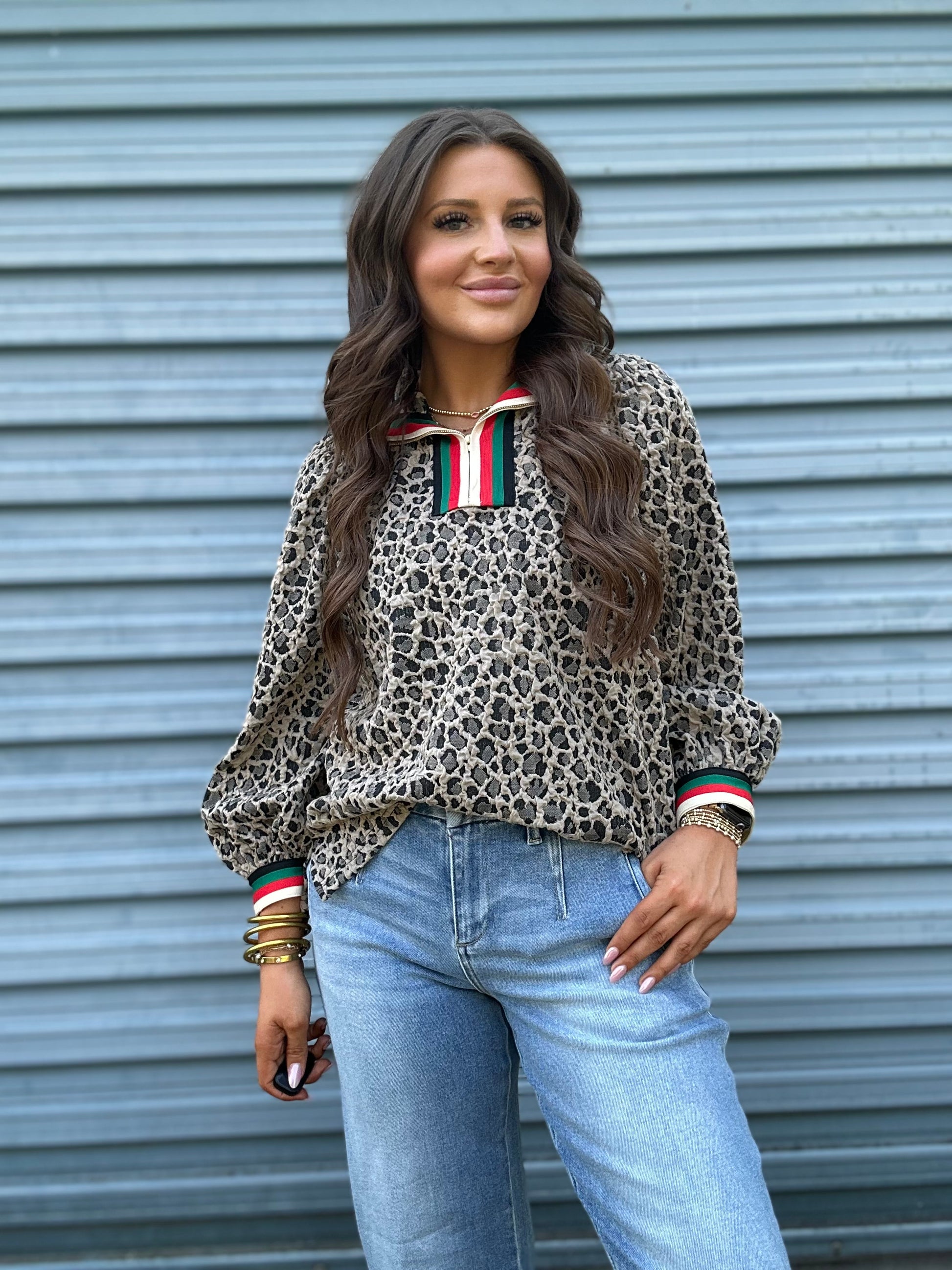 Unleash your wild side with the Rosso Stripe Leopard Top! This unique long-sleeved shirt combines a bold leopard print with striking red, white, and green stripes on the chest, creating a statement piece that's sure to turn heads. The zippered neckline adds a touch of sporty flair, while the classic collar keeps it versatile. Perfect for adding an edgy twist to any outfit, this top is a must-have for those who love to stand out from the crowd.