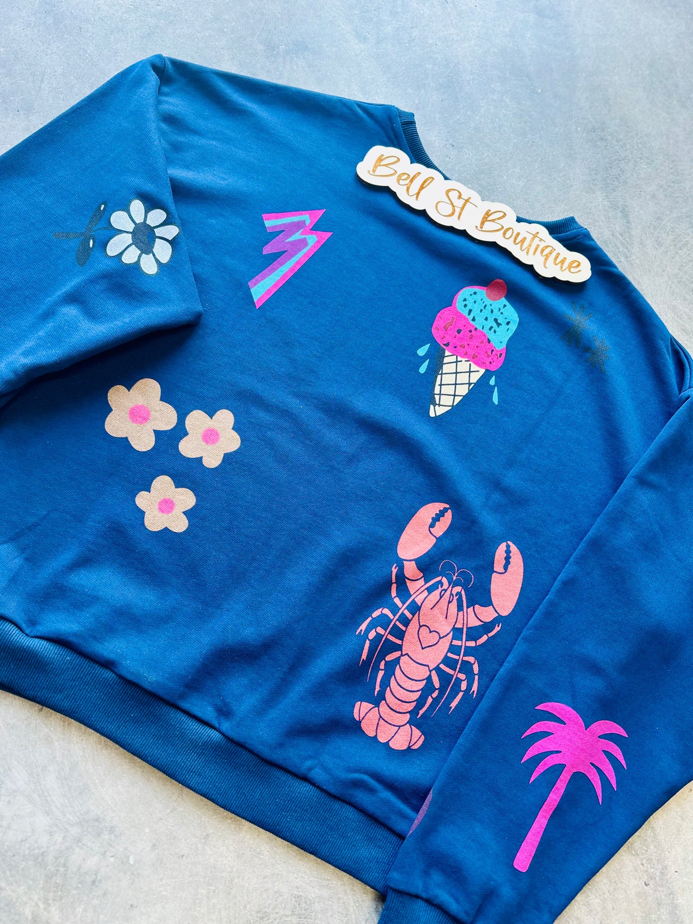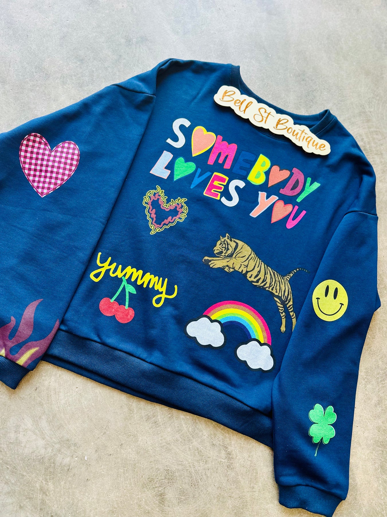 Make a statement in this navy blue sweatshirt, perfect for adding a pop of personality to any outfit. The sweatshirt features an array of vibrant patches, including a heart, rainbow, tiger, and the cheerful message 'Somebody Loves You.' This sweatshirt is sure to turn heads.