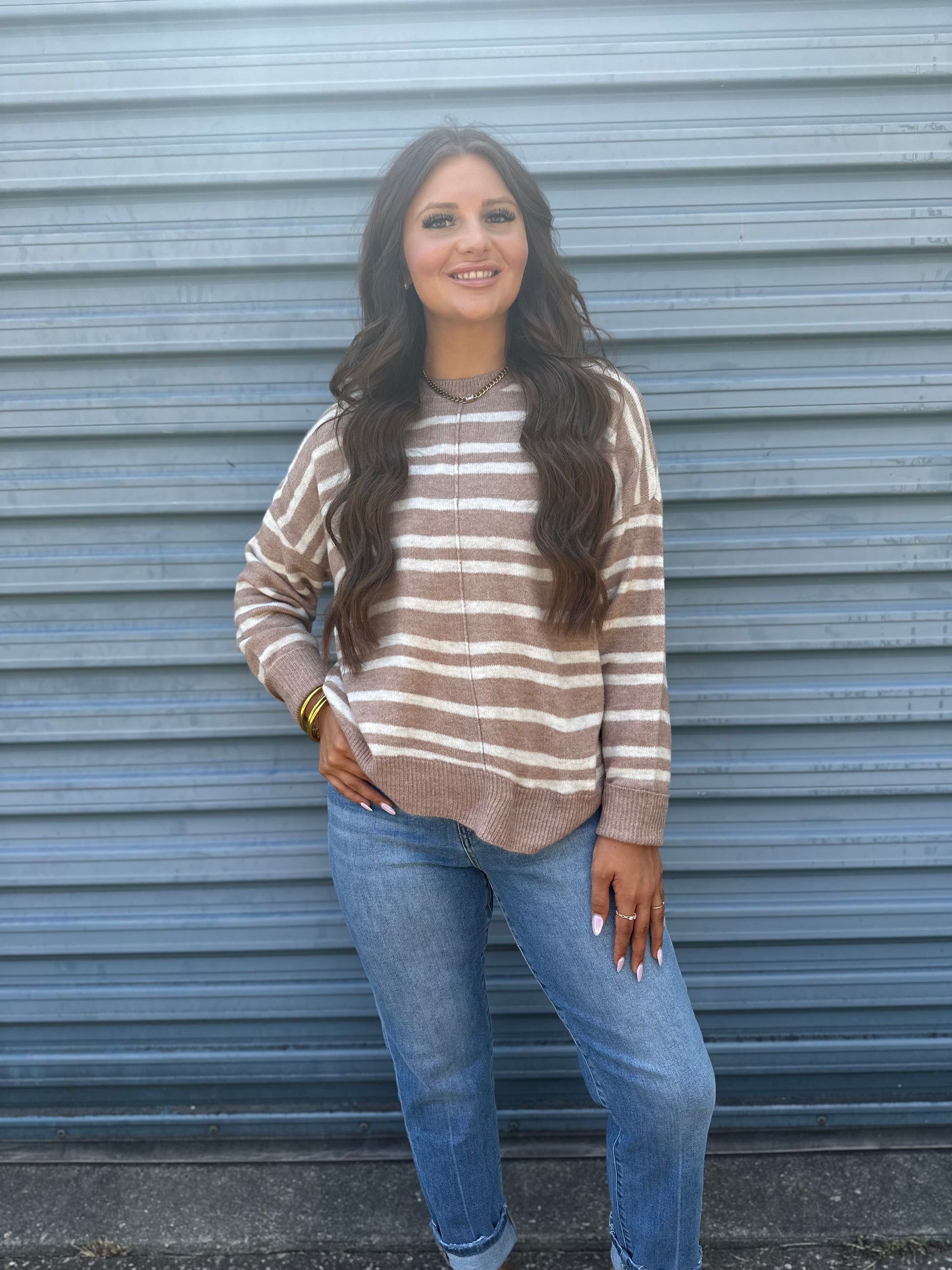 This beige and white striped sweater is a versatile and stylish piece, perfect for adding a touch of casual elegance to any outfit. The neutral color palette makes it easy to pair with a variety of bottoms, while the classic stripe pattern offers a timeless appeal. Made from a comfortable knit fabric, this sweater is ideal for layering or wearing on its own, providing warmth and style in equal measure. The relaxed fit ensures all-day comfort, making it a go-to choice for effortless chic.