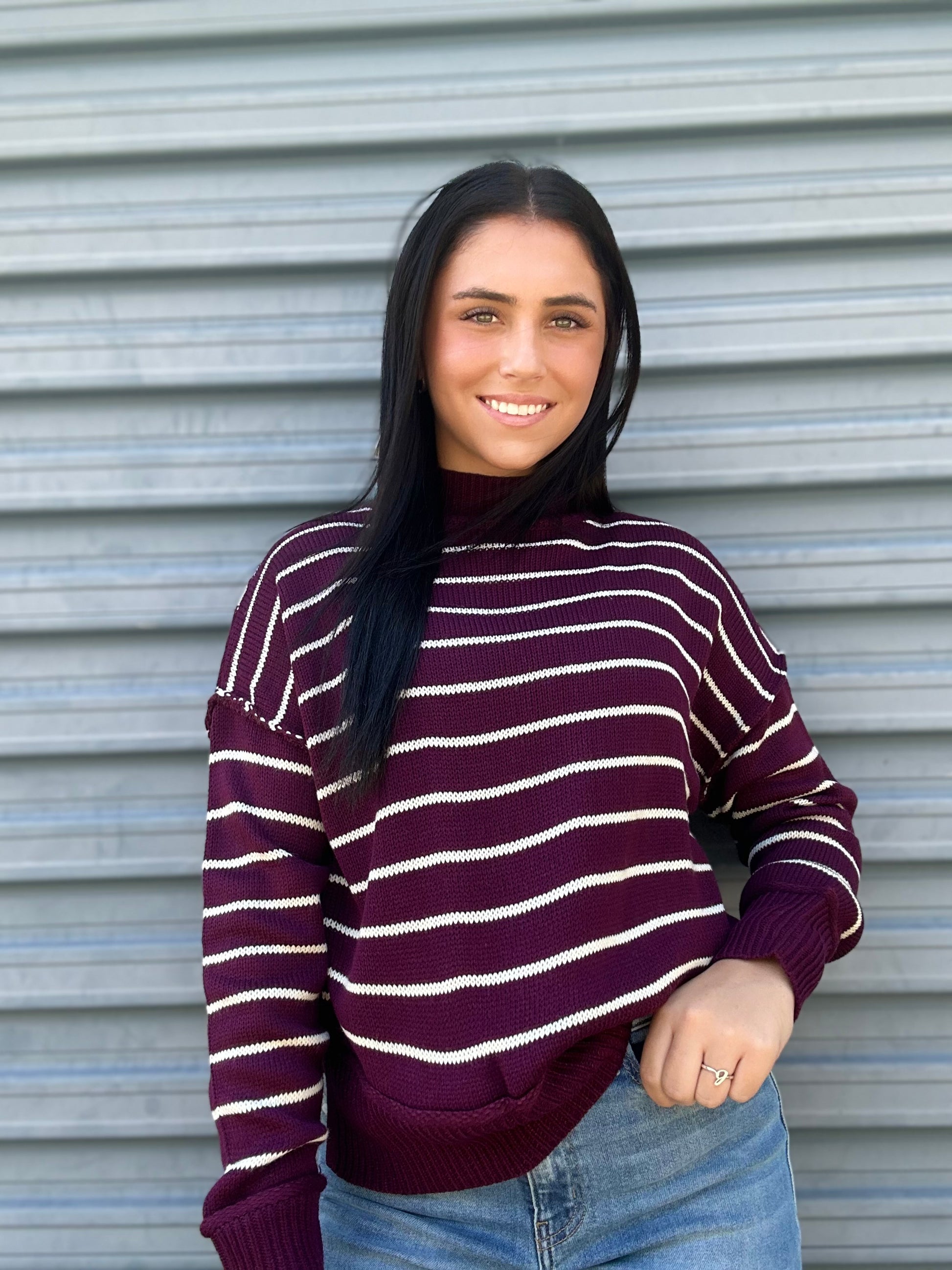 Introducing the perfect blend of classic design and modern comfort with our Burgundy and White Striped Mock Neck Sweater. This stylish piece features a timeless horizontal stripe pattern in rich burgundy and crisp white, making it a versatile addition to any wardrobe. The mock neck design adds a touch of sophistication, while the ribbed cuffs and hem ensure a snug and comfortable fit.