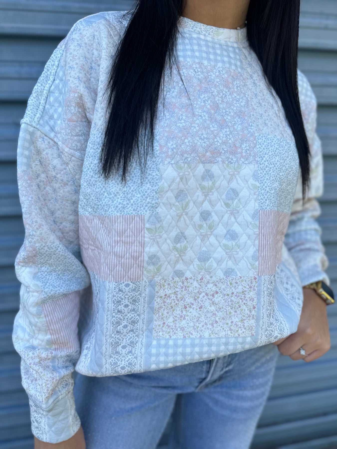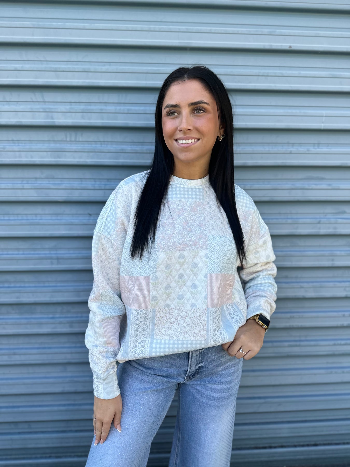 Cozy up in vintage charm with our Sweet Patchwork Pullover. This soft sweatshirt features a quilt-inspired design with delicate pastel prints and textured stitching that give it a timeless, handcrafted feel. The relaxed fit and lightweight fabric make it perfect for year-round wear — pair it with jeans or leggings for an effortlessly cute, comfy look.