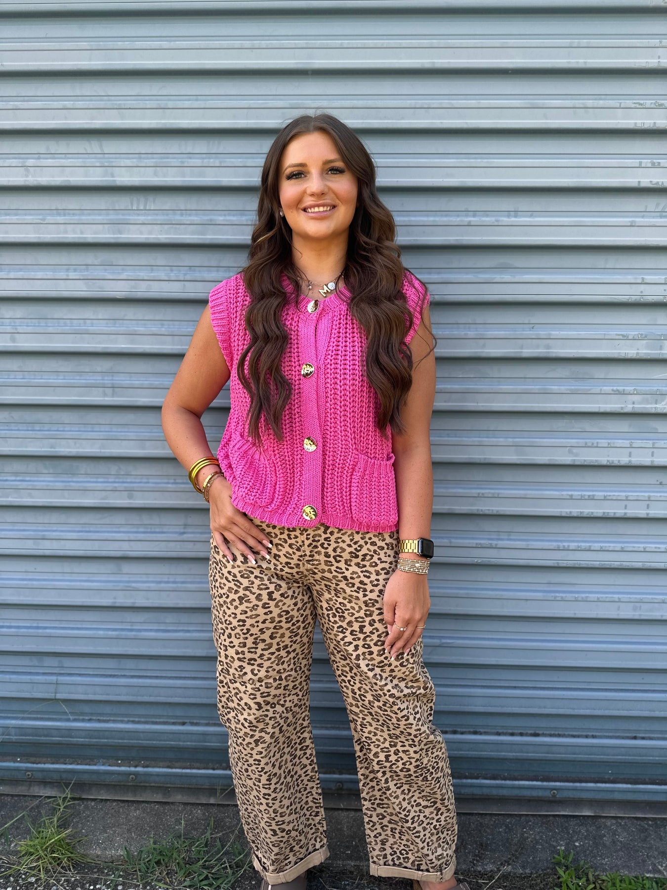 Add a pop of bold color to your look with our Hot Pink Knit Button-Up Vest! Featuring chunky knit detailing, luxe gold statement buttons, and front pockets for a touch of charm, this sleeveless sweater vest is perfect for layering or rocking solo. Style it with jeans or printed pants (like these fierce leopard flares!) for a trendy, confident vibe. Cozy meets glam in the best way!