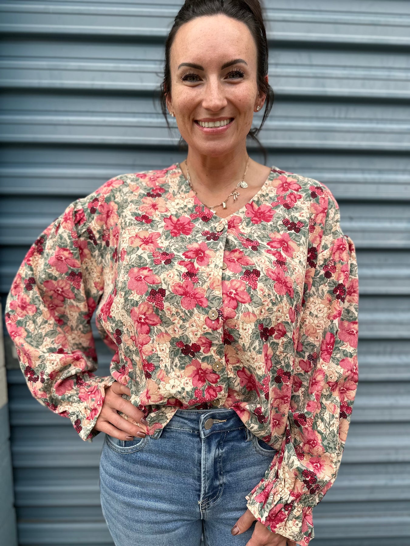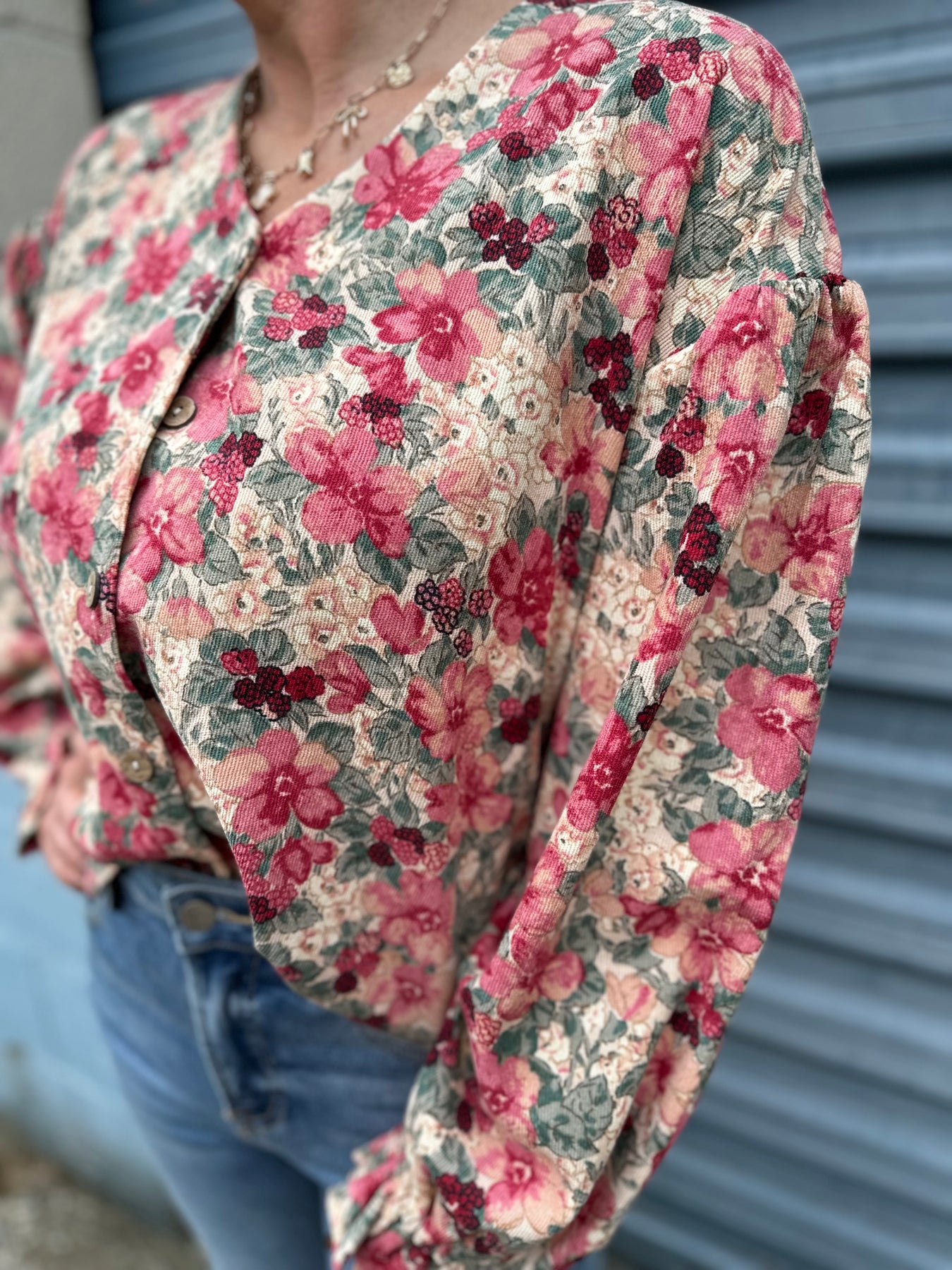 Vintage charm meets modern comfort in this floral corduroy top. Featuring a soft corduroy texture, button-up front, and a flattering v-neckline, this piece is finished with ruffled cuffs for a touch of femininity. The vibrant floral print in cream and pink adds a timeless, romantic feel—perfect for pairing with jeans, skirts, or layering under a jacket.