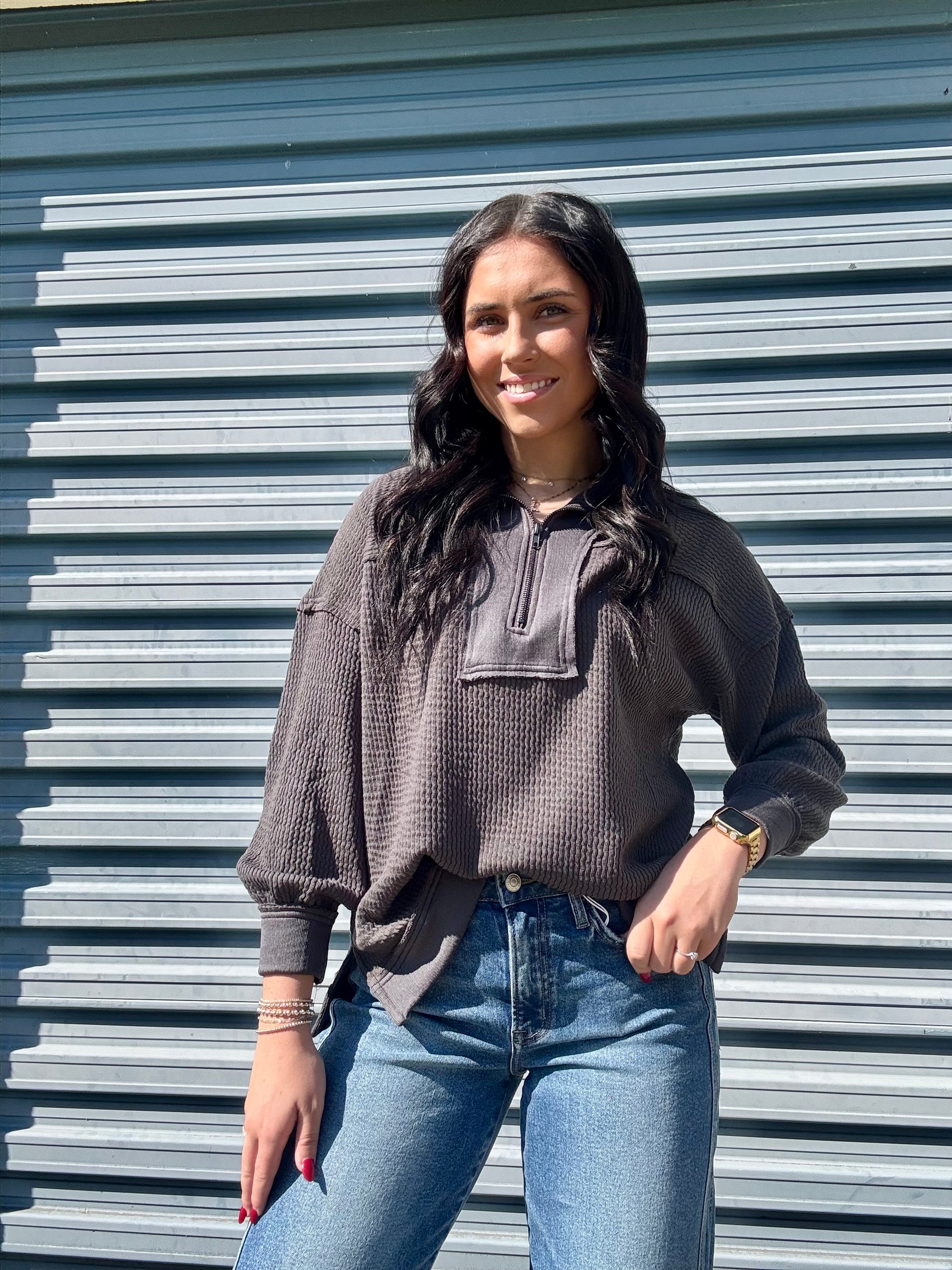 This half zip collared long sleeve top features a textured waffle knit fabric that offers both warmth and breathability. The half zip design allows for easy layering and adjustable ventilation, while the classic collar adds a touch of sophistication. Perfect for casual wear or layering on cooler days, this top combines comfort with a stylish, timeless look.