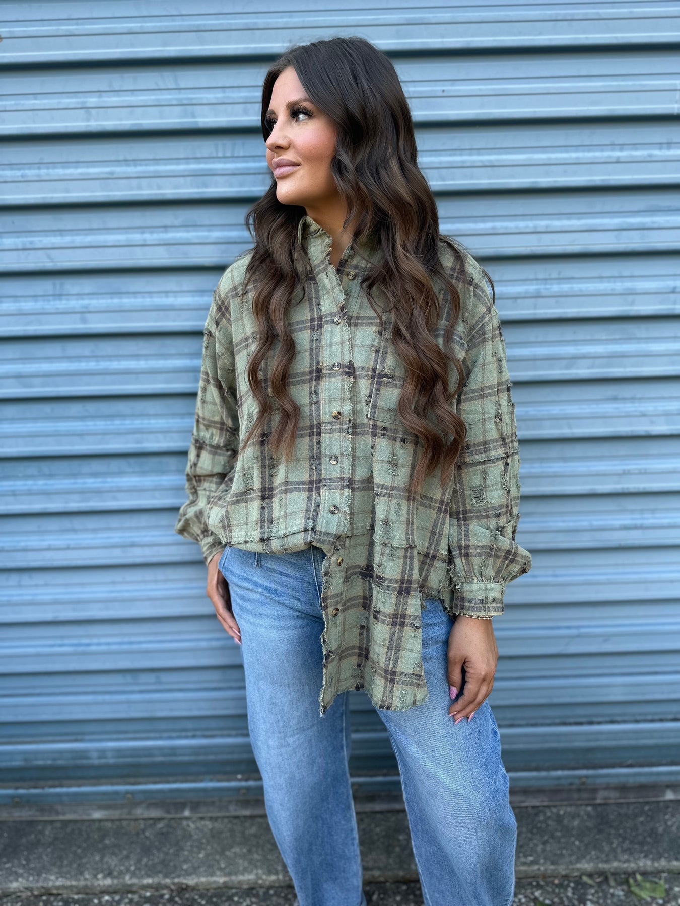 distressed, oversized plaid flannel in a muted sage green color with brown and beige plaid lines. It features a button-down front, collar, and long sleeves with buttoned cuffs. The fabric appears soft and textured, giving it a slightly worn-in, vintage look. The hem is uneven and frayed, adding to the relaxed, casual vibe.