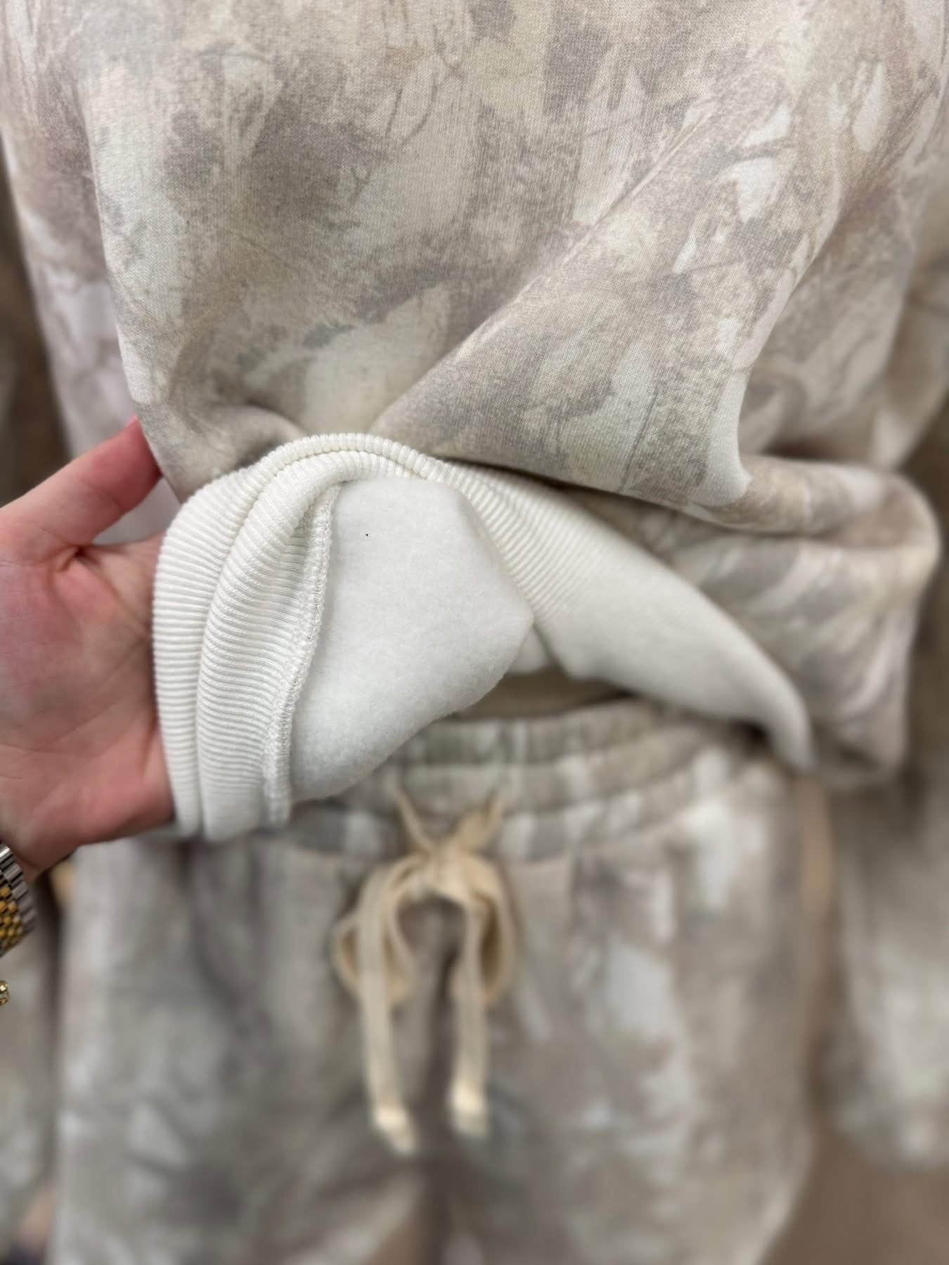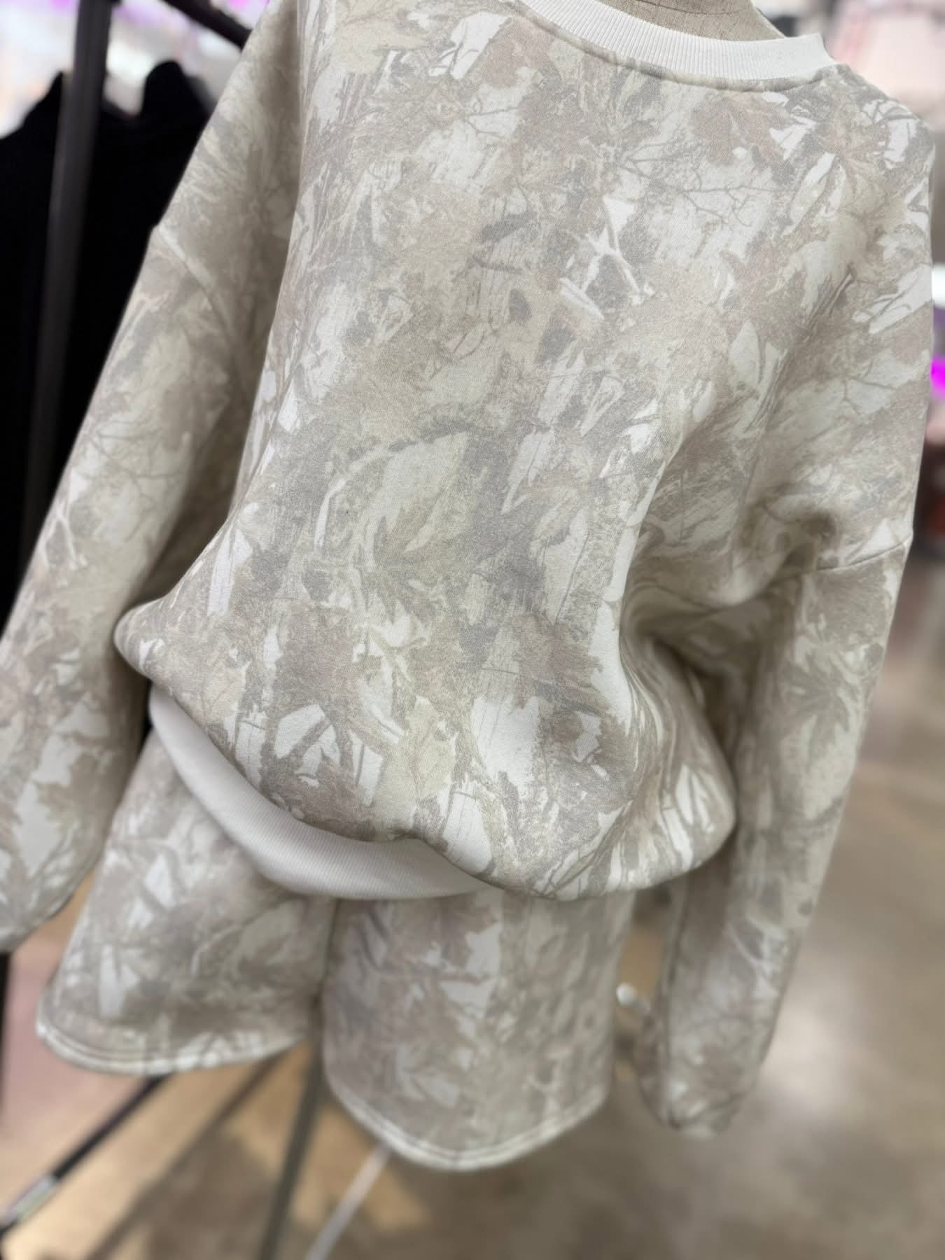Stay cozy and cute in this neutral lounge set! Featuring a soft oversized sweatshirt and matching drawstring shorts with a subtle tonal print, this set is perfect for running errands, lounging at home, or grabbing coffee with friends. Effortless style meets all-day comfort—you’ll live in this one!